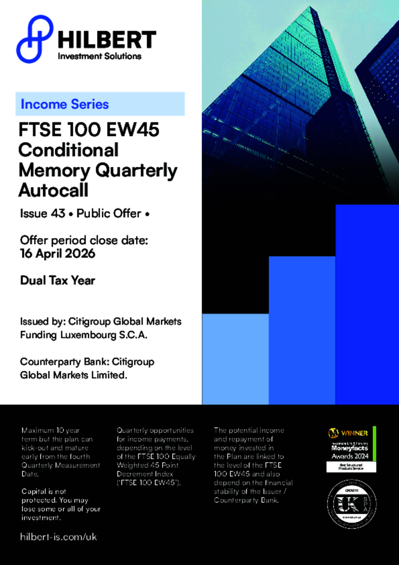 Minimum investment £10000 The Hilbert FTSE 100 EW45 Defensive Semi-Annual Autocall (April 2026 – Issue 06) is a maximum 10-year investment offering a Fixed Growth Return equivalent to 4.25% (8.50% p.a.) for each Semi-Annual Measurement Date since the Start Date. Don’t Forget The Risks Important: The closing date for applications by cheque is 07 April 2026 and by bank …