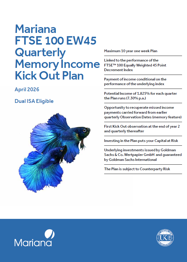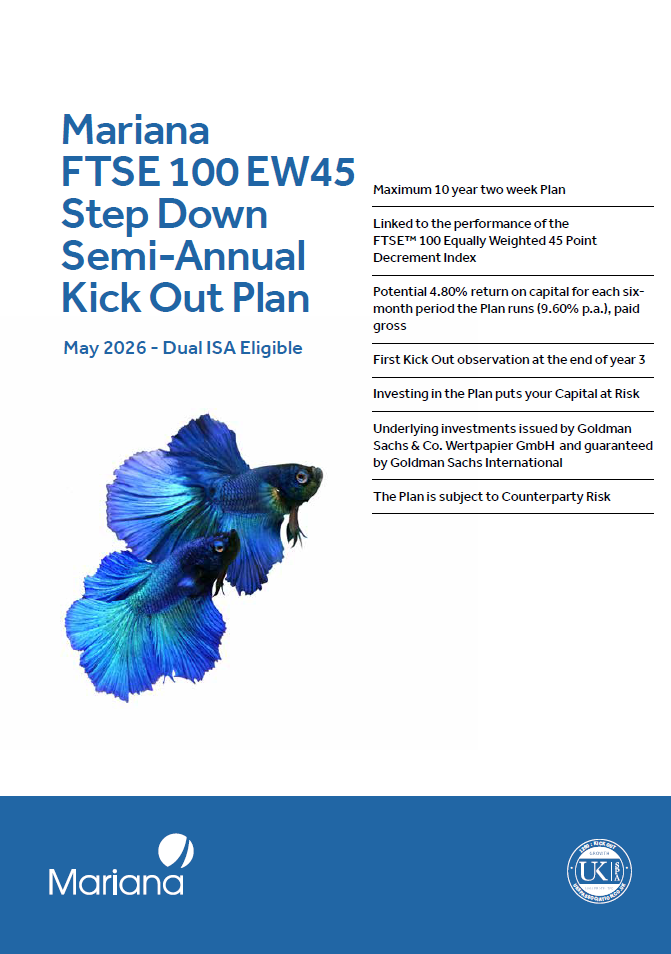 Minimum investment amount £10000 The Mariana FTSE 100 EW45 Step Down Semi-Annual Kick Out Plan – May 2026 is a maximum 10-years, 2-weeks investment offering 4.80% return on investment for each six-month period the Plan runs (9.60% p.a.), paid gross. The Potential Return will only be paid if the Plan kicks out. This plan is …