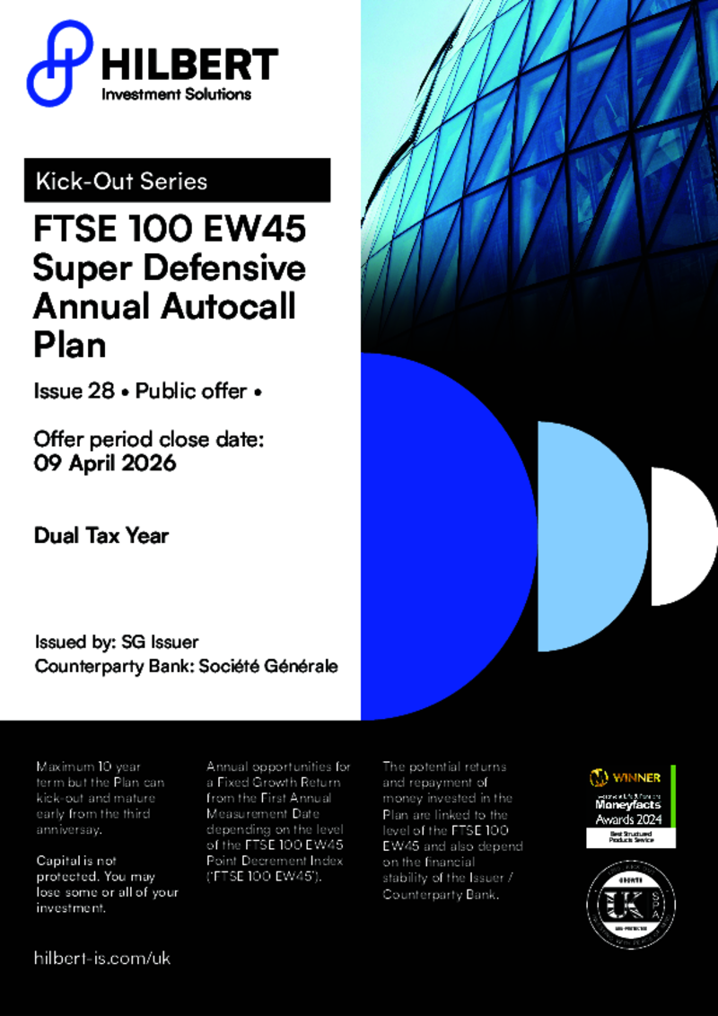 Minimum investment £10000 The Hilbert FTSE 100 EW45 Super Defensive Annual Autocall (April 2026 – Issue 28) is a maximum 10-year investment offering a Fixed Growth Return equivalent to 7.50% p.a. for each Annual Measurement Date since the Start Date. Don’t Forget The Risks Important: The closing date for applications by cheque is 07 April 2026 and by bank …