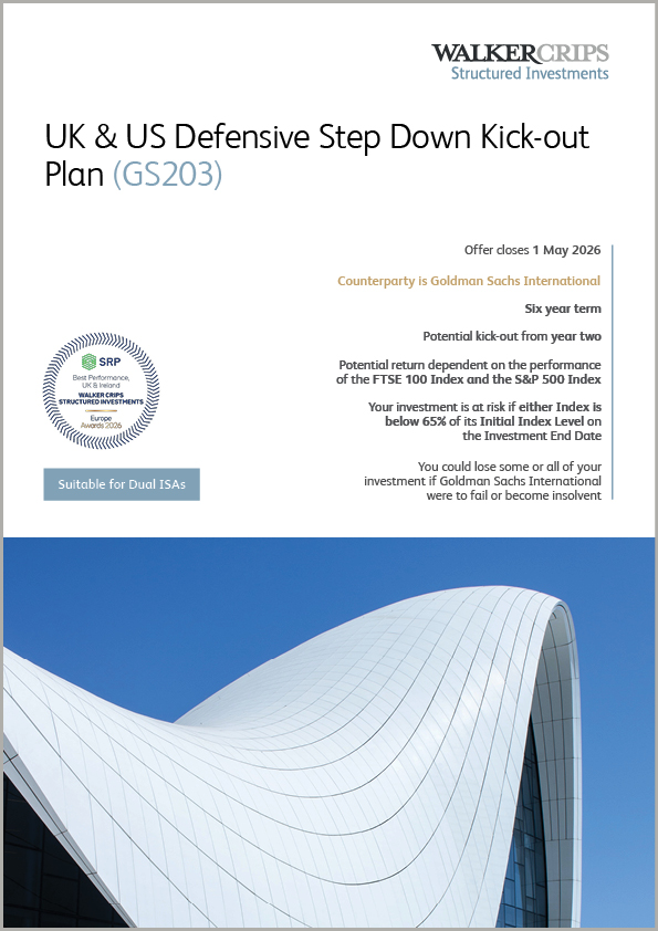 Minimum investment £10000 The Walker Crips UK & US Defensive Step Down Kick-out Plan (GS203) is a maximum six year investment offering a Potential gross investment return of 8.20% p.a. and a potential kick-out from year two depending on the performance of the FTSE 100 Index and the S&P 500 Index. This plan is only …