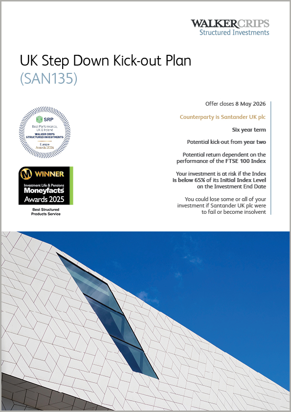 Minimum investment £10000 The Walker Crips UK Step Down Kick-out Plan (SAN135) is a maximum six year investment offering a Potential gross investment return of 7.0% p.a. and a potential kick-out from year two depending on the performance of the FTSE 100 Index. This plan is only available on an Advised Basis. Don’t Forget The …