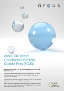 The Arcus 10Y Mistral Conditional Income Kickout Plan (SG33) is a maximum 10 year investment offering a Potential return of 2.50% per quarter (10% p.a.). The interest is paid if the Net Asset Value (‘NAV’) of the Mistral US Selection Fund (the ‘Mistral Fund’) is at or above 50% of its Start Level on an Income Date. This plan is only available on an Advised basis.