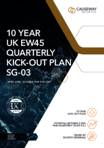 The Causeway Securities 10 Year UK EW45 Quarterly Kick Out Plan – April 26 (SG-03) is a 10-year investment offering a Potential Investment Return of 2.50% per quarter (10.0% p.a.) for each quarter the Plan has existed.
