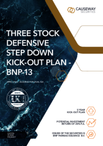 The Causeway Securities Three Stock Defensive Step Down Kick-Out Plan – April 2026 (BNP-13) is a maximum 5-year investment offering a Potential Investment Return of 20% per annum for each year that the plan has existed.