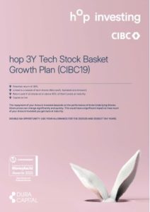 The hop 3Y Tech Stock Basket Growth Plan (CIBC19) is a maximum 3-year investment offering a potential return of 39% (13% p.a.) paid at maturity, dependent on the performance of a basket of technology shares (Microsoft, Alphabet and Amazon). This plan is only available on an advised basis.