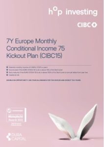 The hop 7Y Europe Monthly Conditional Income 75 Kickout Plan (CIBC15) is a maximum 7-year investment offering a Potential Income of 0.585% per month (7.02% p.a.), paid if the index closes at or above 75% of its Start Level on an Income Date.