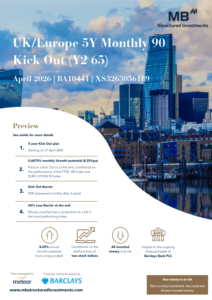 The MB Structured Investments UK/Europe 5Y Monthly 90 Kick Out (Y2 65) April 2026 – BA10441 plan is a maximum 5-years, 3-weeks investment offering 0.6875% monthly Growth potential (8.25%pa)