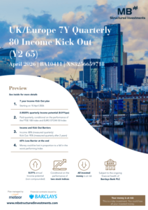 The MB Structured Investments UK/Europe 7Y Quarterly 80 Income Kick Out (Y2 65) April 2026 – BA10411 plan is a maximum 7-years, 3-weeks investment offering 2.0025% quarterly Income potential (8.01%pa)