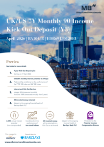 The MB Structured Investments UK/US 7Y Monthly 90 Income Kick Out Deposit (Y3) April 2026 – BA10438 plan is a maximum 7 year 3 weeks investment offering 0.5025% monthly Interest potential