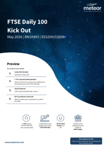 The Meteor FTSE Daily 100 Kick Out May 2026 – BN10493 plan is a maximum 6-years, 3-week investment offering 7.75% annual Growth potential