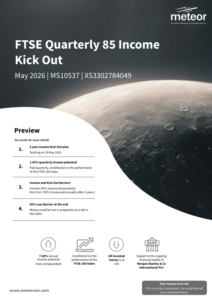 The Meteor FTSE Quarterly 85 Income Kick Out May 2026 – MS10537 plan is a maximum 6-years, 3-week investment offering 1.85% quarterly Income potential (7.40%pa)