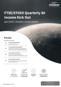 The Meteor FTSE/STOXX Quarterly 80 Income Kick Out April 2026 – CR10450 plan is a maximum 8-years, 3-week investment offering 2.14% quarterly Income potential (8.56%pa)