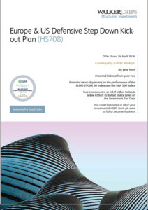 The Walker Crips Europe & US Defensive Step Down Kick-out Plan (HS708) plan is a six year investment offering a Potential gross investment return of 8.50% p.a. and a potential kick-out from year two depending on the performance of the EURO STOXX 50 Index and the S&P 500 Index.