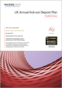 The Walker Crips UK Annual Kick-out Deposit Plan (SAN134) is a 6 year investment which provides a potential return of 6.25% per annum and a potential kick-out from year two, dependent on the performance of the FTSE 100 Index. This plan is only available on an Advised basis.