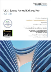 The Walker Crips UK & Europe Annual Kick-out Plan (CT151) is a six year investment offering a Potential gross investment return of 12.50% per annum, payable on maturity and a potential kick-out from year one depending on the performance of the FTSE 100 Index and the EURO STOXX 50 Index.