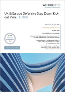 The Walker Crips UK & Europe Defensive Step Down Kick-out Plan (HS709) is a maximum 6-year investment offering a Potential gross investment return of 7.50% per annum, payable on maturity and a potential kick-out from year two depending on the performance of the FTSE 100 Index and the EURO STOXX 50 Index