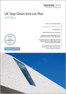 The Walker Crips UK Step Down Kick-out Plan (HS704) plan is a maximum 6-years investment offering a Potential gross investment return of 7.40% p.a. and a potential kick-out from year one depending on the performance of the FTSE 100 Index.