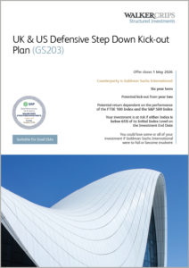 The Walker Crips UK & US Defensive Step Down Kick-out Plan (GS203) is a maximum six year investment offering a Potential gross investment return of 8.20% p.a. and a potential kick-out from year two depending on the performance of the FTSE 100 Index and the S&P 500 Index. This plan is only available on an Advised Basis.