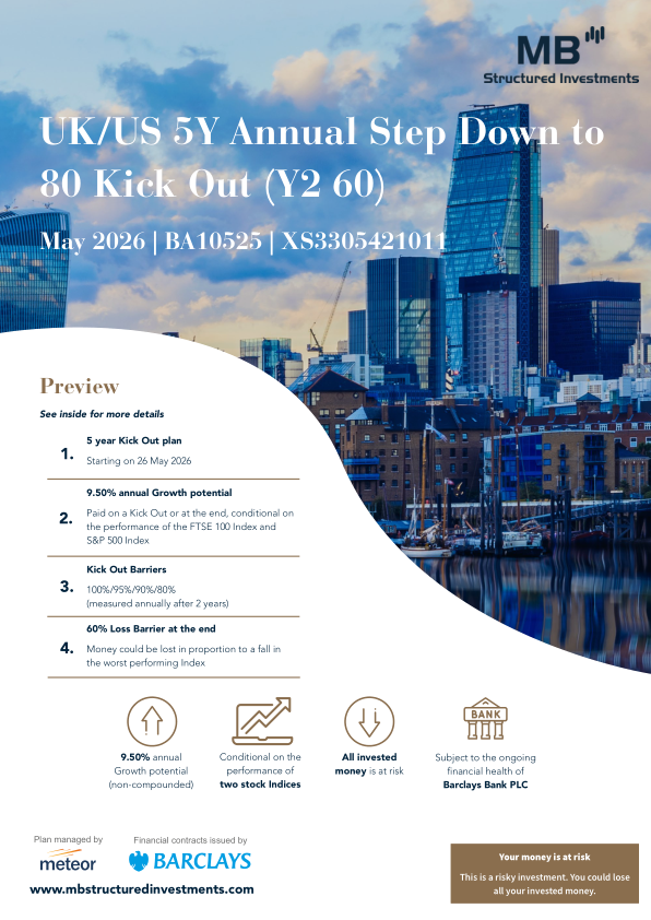 Minimum investment £5000 The MB Structured Investments UK/Europe 5Y Quarterly 85 Memory Income Kick Out (Y2 65) April 2026 – BA10444 plan is a maximum 5-years, 3-weeks investment offering 1.875% quarterly Income potential (7.50%pa) Don’t Forget The Risks Important: The closing date for applications by cheque is 17 April 2026 and by bank transfer is 21 April …